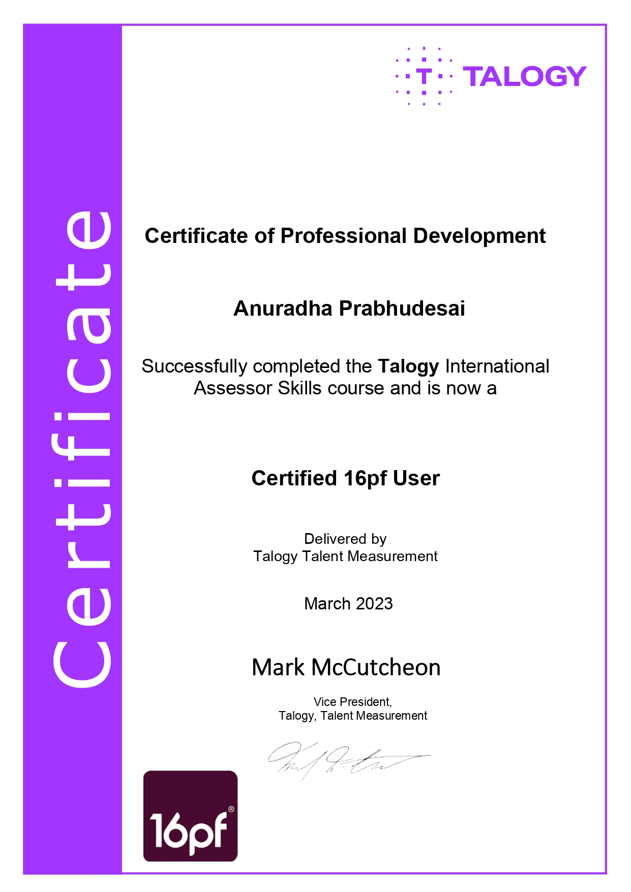 Psychometrica’s reports based on the 16PF personality test are comprehensive and insightful. Areas of strength and development, and action plan are also part of the report. This report, especially when accompanied by a one-to-one counseling session by Psychometrica’s experienced team of psychologists, can be instrumental in creating insight and awareness and building a sense of ownership in individuals.